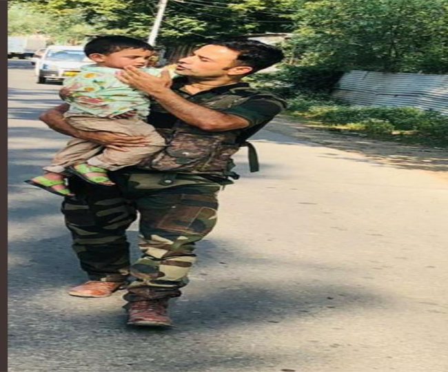 आतंकियों की गोलीबारी के दौरान आई यह तस्वीर तेजी से वायरल हो रही है। जवान इस फोटो में बच्चे से बात भी कर रहा है। बच्चे के चेहरे की मासूमियत और जवान की उससे बाद करते हुई तस्वीर छू रही है। बता दें कि कुछ दिन पहले आतंकियों ने एक सीआरपीएफ के जवान और एक 3 साल के बच्चे की गोली मारकर हत्या कर दी थी। वाघमा के बिजबेहरा में हुई इस घटना में शामिल आतंकियों को जवानों के कल ढेर कर बदला ले लिया था।