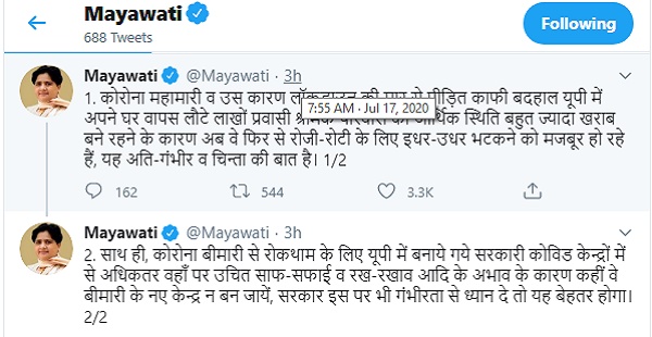 बसपा मुखिया मायावती ने कहा कि कोरोना महामारी व उस कारण लॉकडाउन की मार से पीड़ित काफी बदहाल उत्तर प्रदेश में अपने घर वापस लौटे लाखों प्रवासी श्रमिक परिवारों की आर्थिक स्थिति बहुत ज्यादा खराब बने रहने के कारण अब वह लोग फिर से रोजी-रोटी के लिए इधर-उधर भटकने को मजबूर हो रहे हैं। यह अति-गंभीर व चिन्ता की बात है।