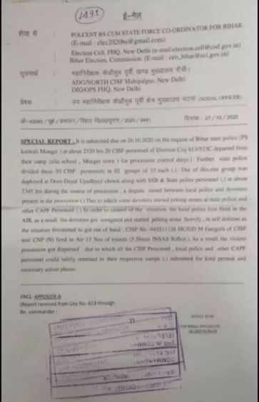 बीते 26 अक्टूबर को सीआईएसएफ ने गोलीकांड की रिपोर्ट अगले ही दिन (27 अक्टूबर) अपने अफसरों को भेज दी थी। इसमें साफ़ लिखा था कि ‘मुंगेर कोतवाली थाना के आग्रह पर सीआईएसएफ की एक टुकड़ी को मूर्ति विसर्जन जुलूस की सुरक्षा के लिए जिला स्कूल वाले कैंप से भेजा गया था। 26 अक्टूबर की देर रात को सीआईएसएफ के 20 जवानों की टुकड़ी को तैनात किया गया।