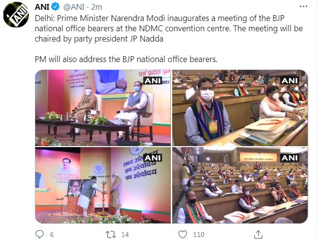नई दिल्ली। कुछ देर में भाजपा के राष्ट्रीय पदाधिकारियों की बैठक दिल्ली के एनडीएमसी कन्वेंशन सेंटर में होने वाली है। इस बैठक को प्रधानमंत्री नरेंद्र मोदी संबोधित करेंगे। इस बैठक में पश्चिम बंगाल, केरल, तमिलनाडु, पुडुचेरी और असम को लेकर चुनावी रणनीति पर मंथन किया जाएगा। इन राज्यों में इसी साल विधानसभा चुनाव होने हैं। सभी राज्यों में भाजपा काफी आक्रमक नजर आ रही है।