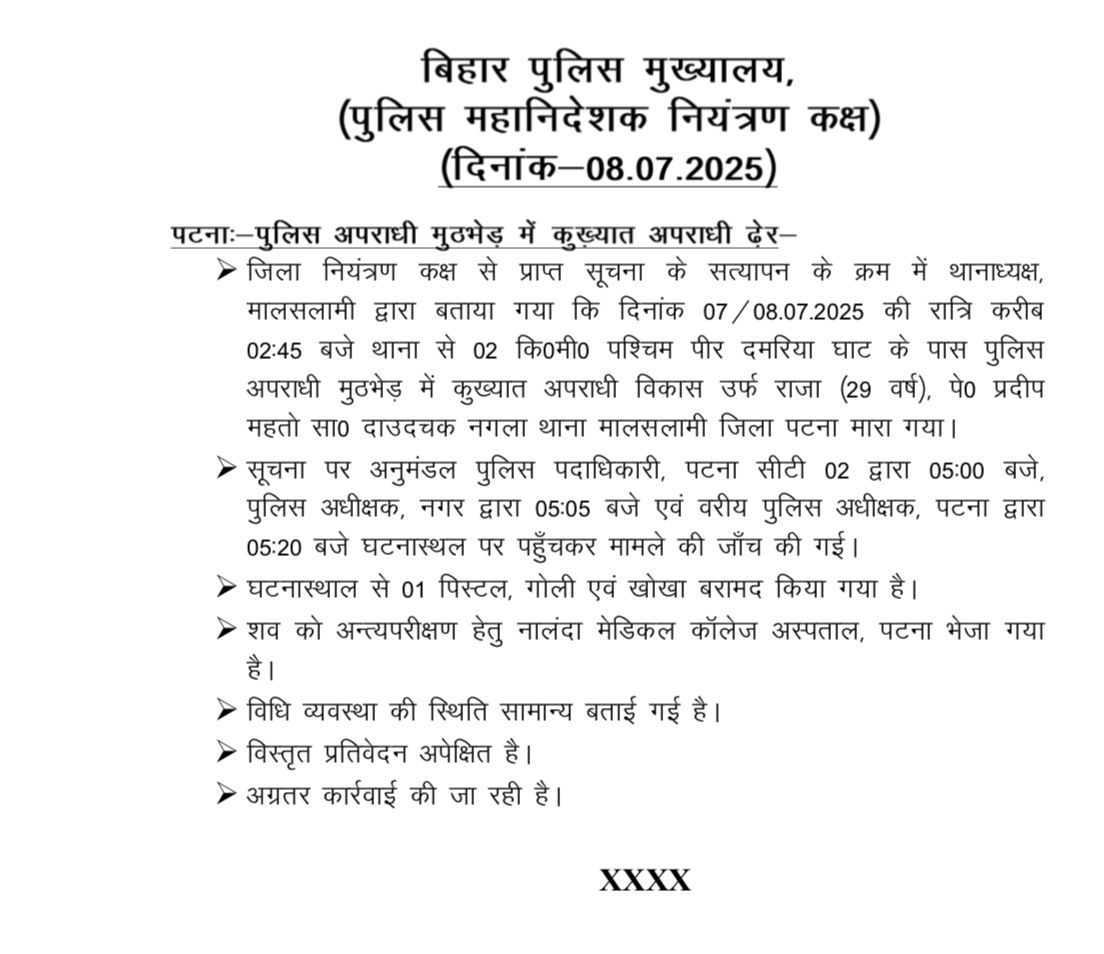 जानकारी के मुताबिक, घटनास्थल से एक पिस्तौल, एक गोली और एक कारतूस बरामद किया गया है। शव को पोस्टमार्टम के लिए पटना के नालंदा मेडिकल कॉलेज भेज दिया गया है।