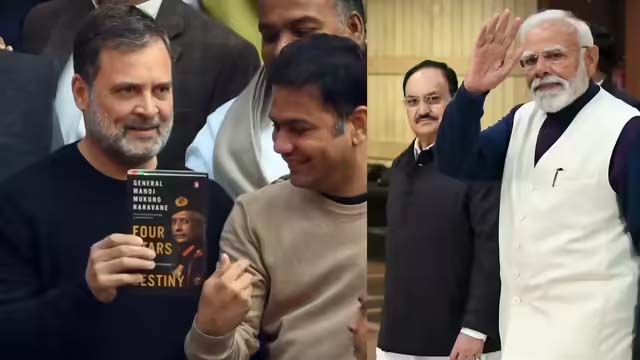 नई दिल्ली: बुधवार को लोकसभा में नेता प्रतिपक्ष राहुल गांधी संसद के बाहर और संसद के अंदर पूर्व आर्मी चीफ जनरल एमएम नरवणे की अप्रकाशित पुस्तक लेकर पहुंचें। वे संसद परिसर में भी वह किताब देखा रहे थे और लोकसभा के अंदर भी लगातार स्पीकर को किताब दिखाते हुए उन्हें बोलने देने की मांग करते रहे। जनरल नरवणे की ऑटोबायोग्राफी ‘फोर स्टार्स ऑफ डेस्टिनी’ में लिखी बातों को लेकर सोमवार से ही सदन में विपक्ष विरोध कर रहा है।